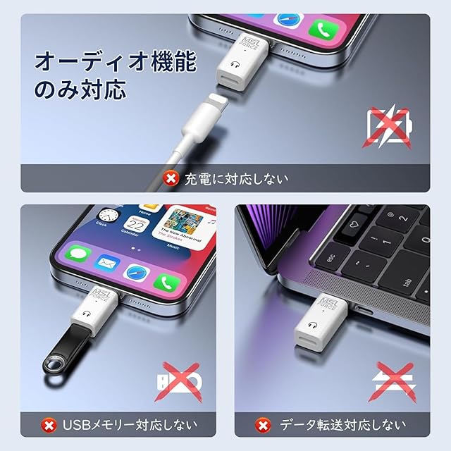 【Lightning to USB-C イヤホン変換アダプタ】 USB-Cポートを搭載したデバイスに接続し、Lightningイヤホンを使用できる「オーディオ専用」の変換アダプタです。Apple純正イヤホンに対応し、iPhoneやiPadに接続できます。
