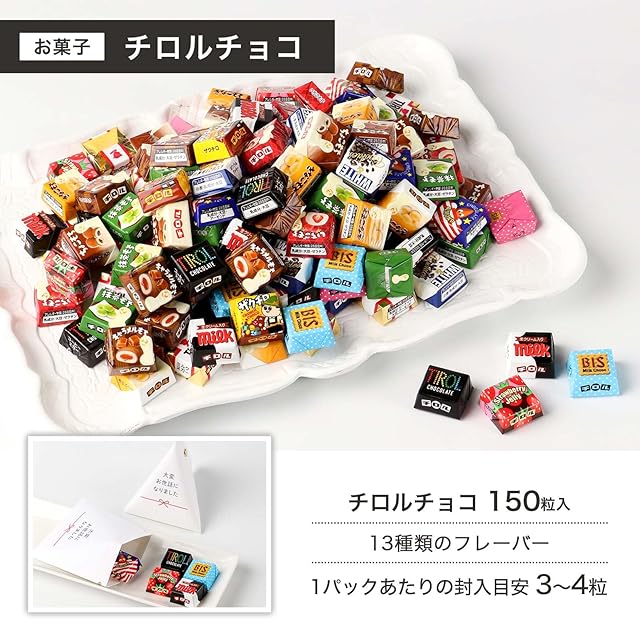 【セット内容】チロルチョコ 13種 150個(フレーバーごとの数量にはバラツキがあります)、テトラパック(お世話になりました)ホワイト48枚 + 留め具