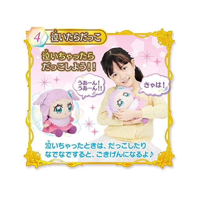 プリキュアが育てることになった「エルちゃん」のお世話ぬいぐるみです。「なでなで」「だっこゆらゆら」「ミルクあげ」「ねかしつけ」など、さまざまお世話あそびが楽しめます。