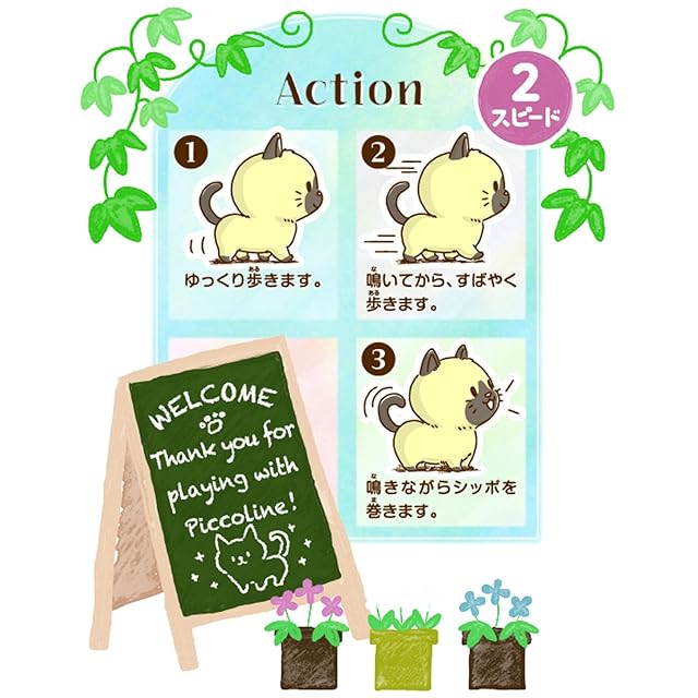 「ピッコリーネ」はちいさくてかわいらしいわんちゃん・ねこちゃんのシリーズです。ゆっくり歩く→鳴いてから素早く歩く→鳴きながらしっぽをまく を繰り返します。