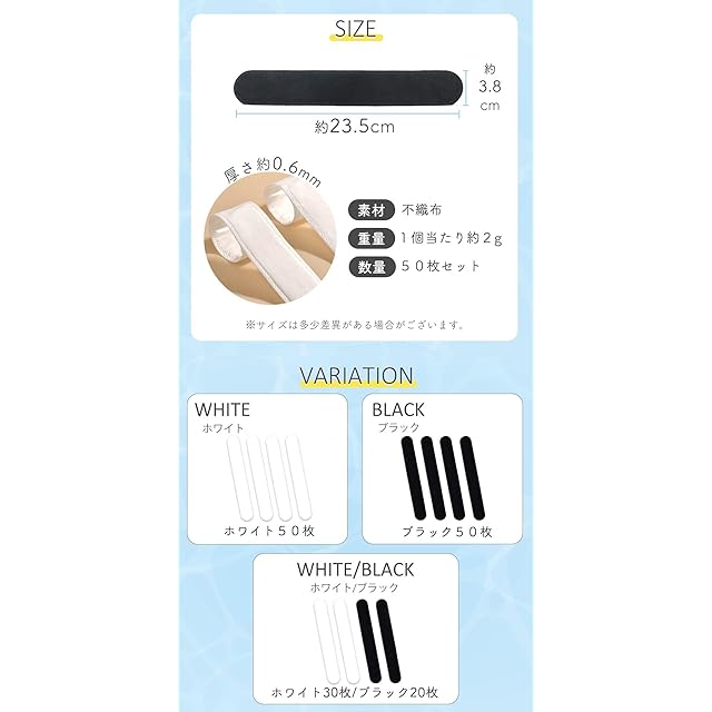 【豊富なカラーバリエーション&汎用性】定番のホワイト・ブラックに加え、ホワイト30枚/ブラック20枚のミックスセットもご用意。帽子の内側の色や用途に合わせて選べるので、見た目も気にせず使えます。デザインや形状を問わずさまざまな帽子にフィットしやすい汎用設計。帽子だけでなく、ワイシャツの襟や衣類の汗ジミ防止としても活用できる汎用性の高さが魅力です