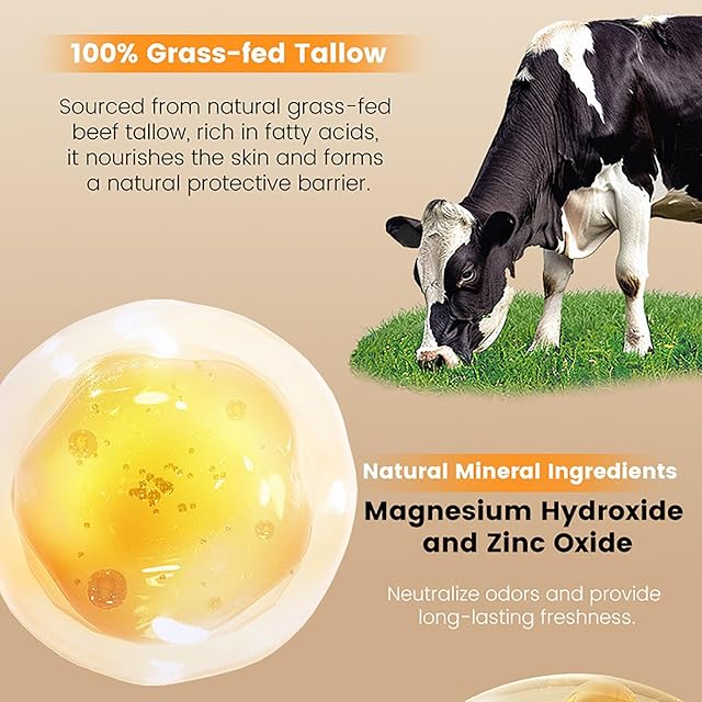 【ナチュラルボディ】牧草飼育牛脂とオーガニックオイルで肌に栄養を与え、ミンEを豊富に含み、抗酸化作用があり、臭いを中和します。