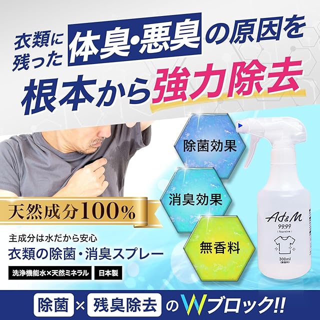 【✅消臭スプレー:除菌×残臭物質の除去で強力消臭】衣類の嫌な臭いを落とすのに最適なpH値に調整した電解水に、洗浄効果の高い天然ミネラルを配合した衣類専用の除菌・消臭スプレー。電気分解によって活性化された非常に浸透力の強い機能水が、繊維に深く入り込んだ皮脂をつかまえて分解。後は洗濯するだけでOKです。
