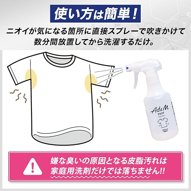 【✅消臭スプレー:使い方はとっても簡単】気になるところにしっとりとするくらい吹きかけて1~3分間放置してから洗濯するだけ。ニオイの原因を根こそぎ除菌・分解・除去します。温めてから使用すると、さらに効果的に汚れが落ちます。