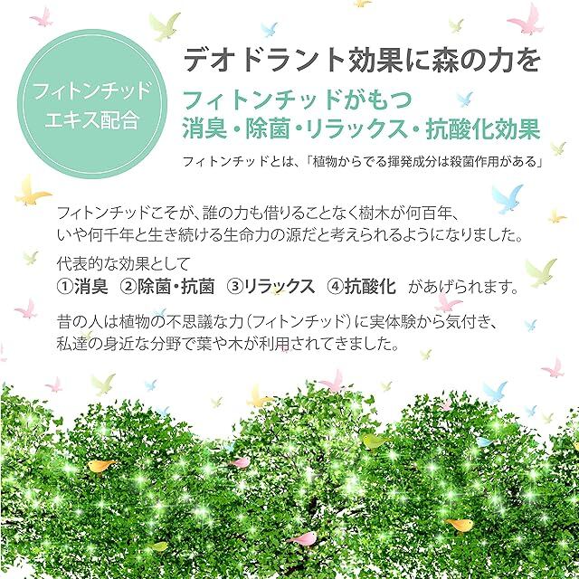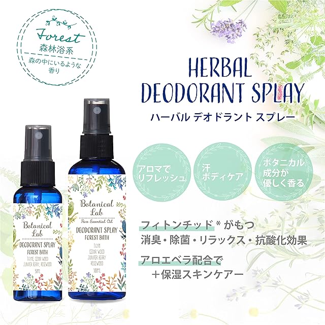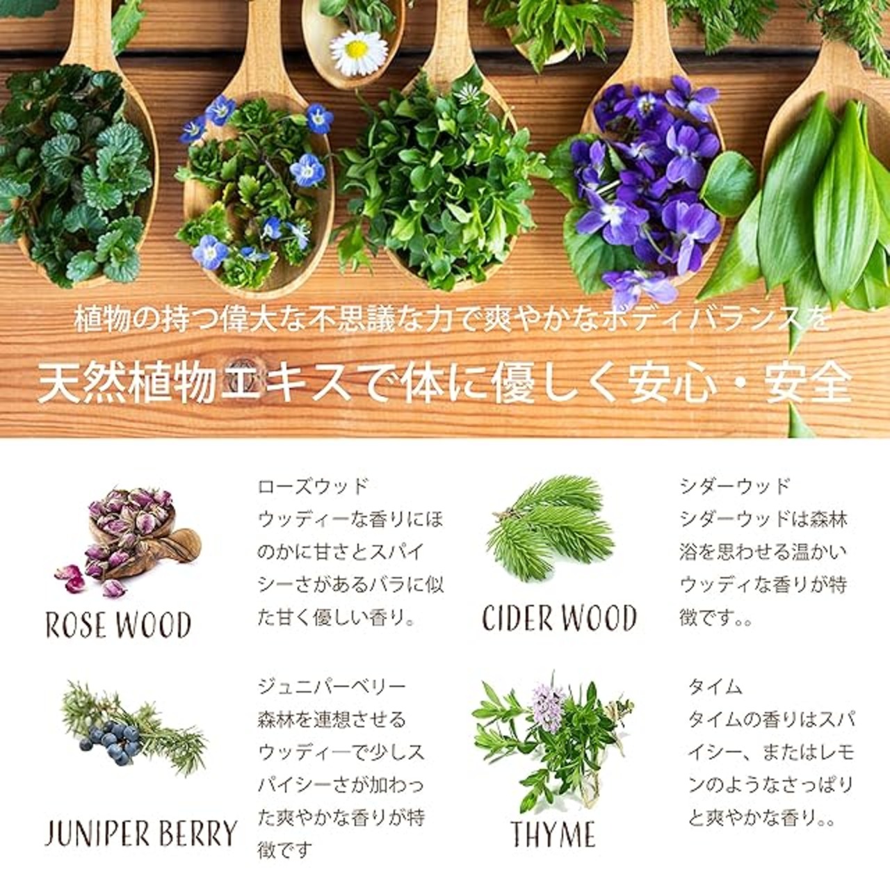 ・天然アロマ, タイム、シダーウッド、ジュニパーベリー、ローズウッドの フレッシュな香りが、体温の上昇と共にボディーを包み込むデオドラントスプレーです。