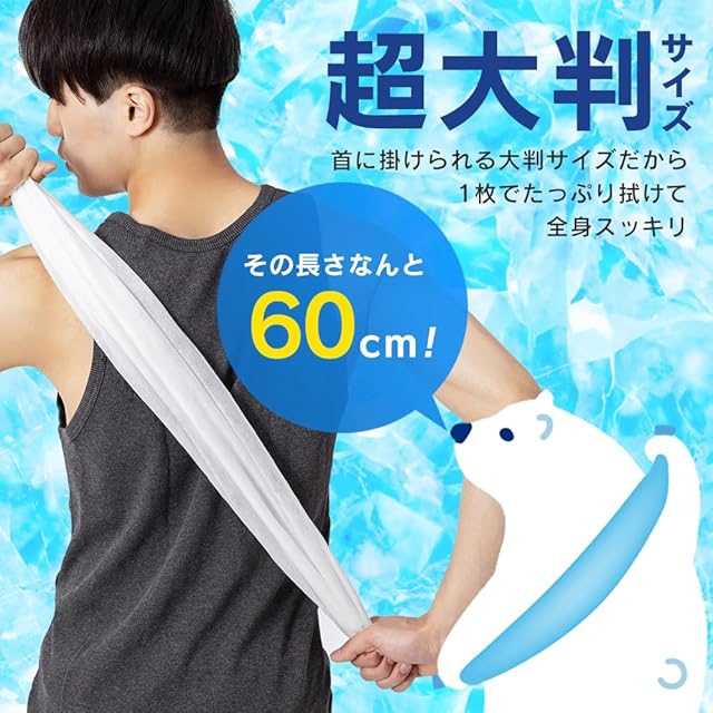 1枚でたっぷり拭けて、ひんやり感ずっと続く。クールタイプの超大判シート。“約60×40cm”の超大判だから、首にかけられる&背中も拭ける!