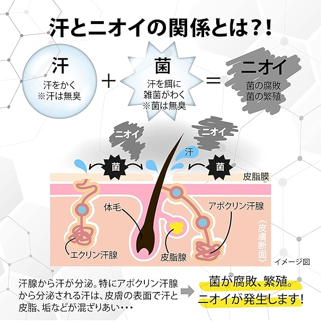 【 汗 と ニオイ の関係 】 実は汗、菌そのものは無臭です。しかし皮膚の表面で汗と皮脂、垢などが混ざりあい、菌の餌となって腐敗・繁殖、その結果ニオイが発生させます。汗をしっかりとブロックすることで、ニオイもプレミアムブロック 。