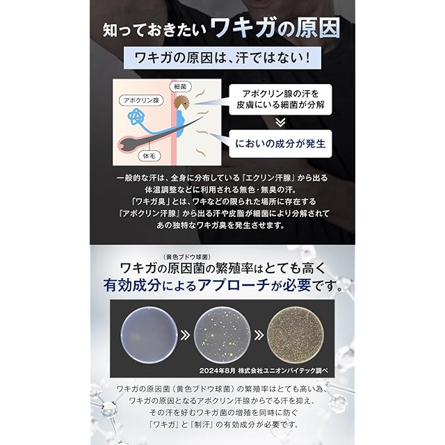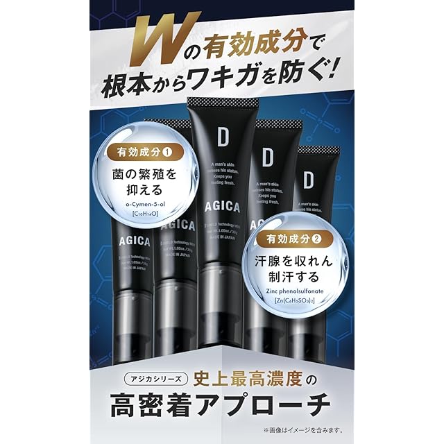 D AGICAは、ワキガ臭の元となるアポクリン汗腺から出る汗をコントロールする「パラフェノールスルホン酸亜鉛」とその汗を好む菌の繁殖を抑える「イソプロピルメチルフェノール」の2大有効成分で、ニオイの発生をWブロックします。