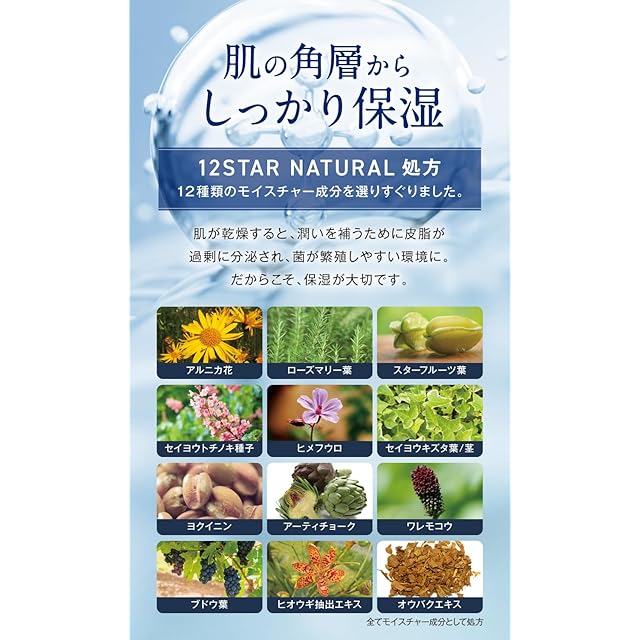 ニオイの原因菌に働くパワーとやさしさを持ち合わせた12種類の天然由来成分を選りすぐりました。それらをベストなバランスで配合することで、年代や肌質を問わずトラブル知らずの肌へと整えます。